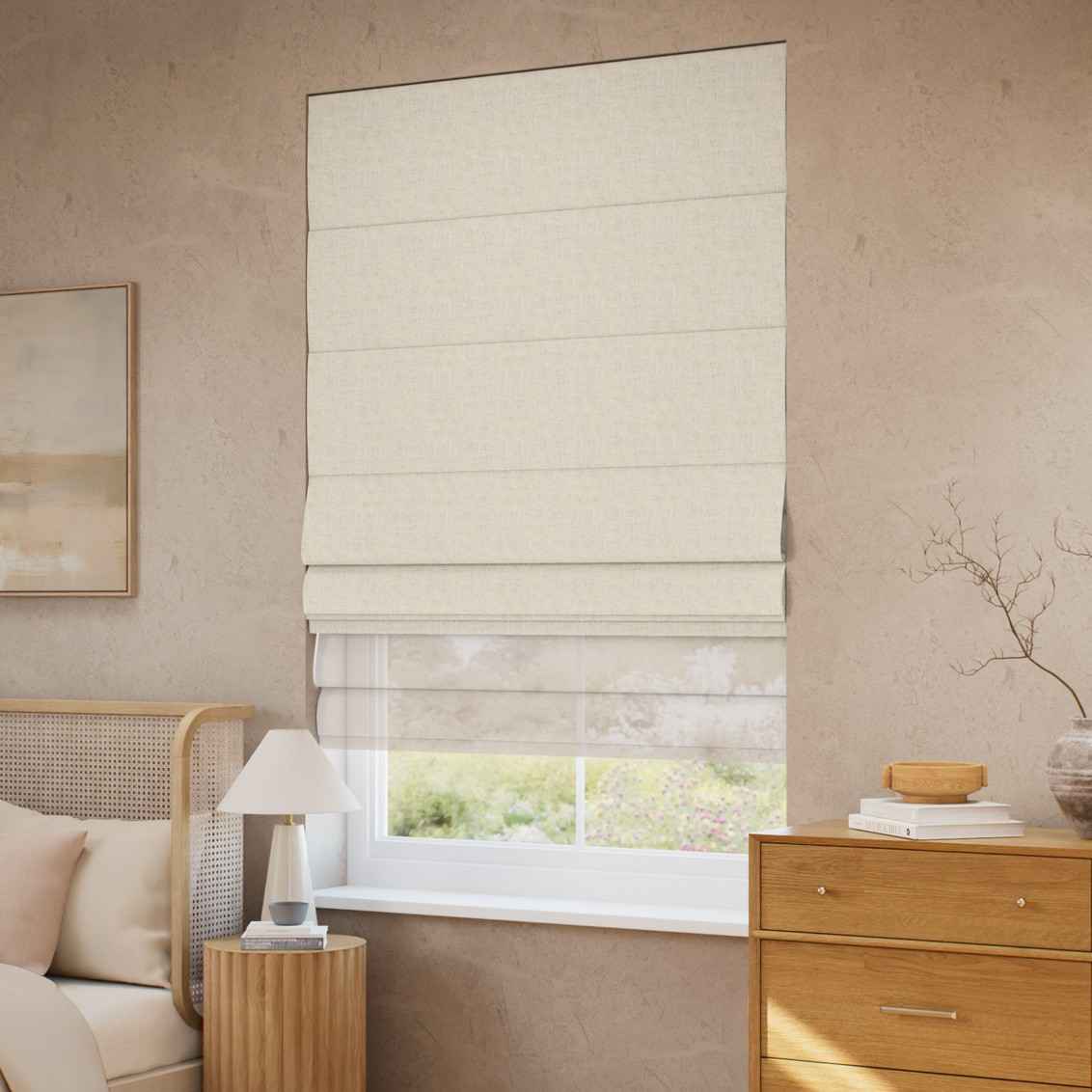 This Bijou linen oatmeal and neutral double Roman blind print combines soft, natural tones with elegant texture. Its durable fabric offers smooth operation, privacy, and a stylish, modern finish for any interior.
