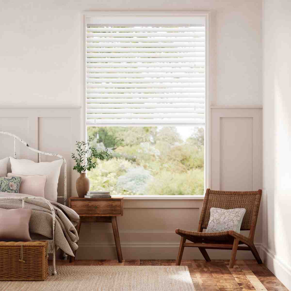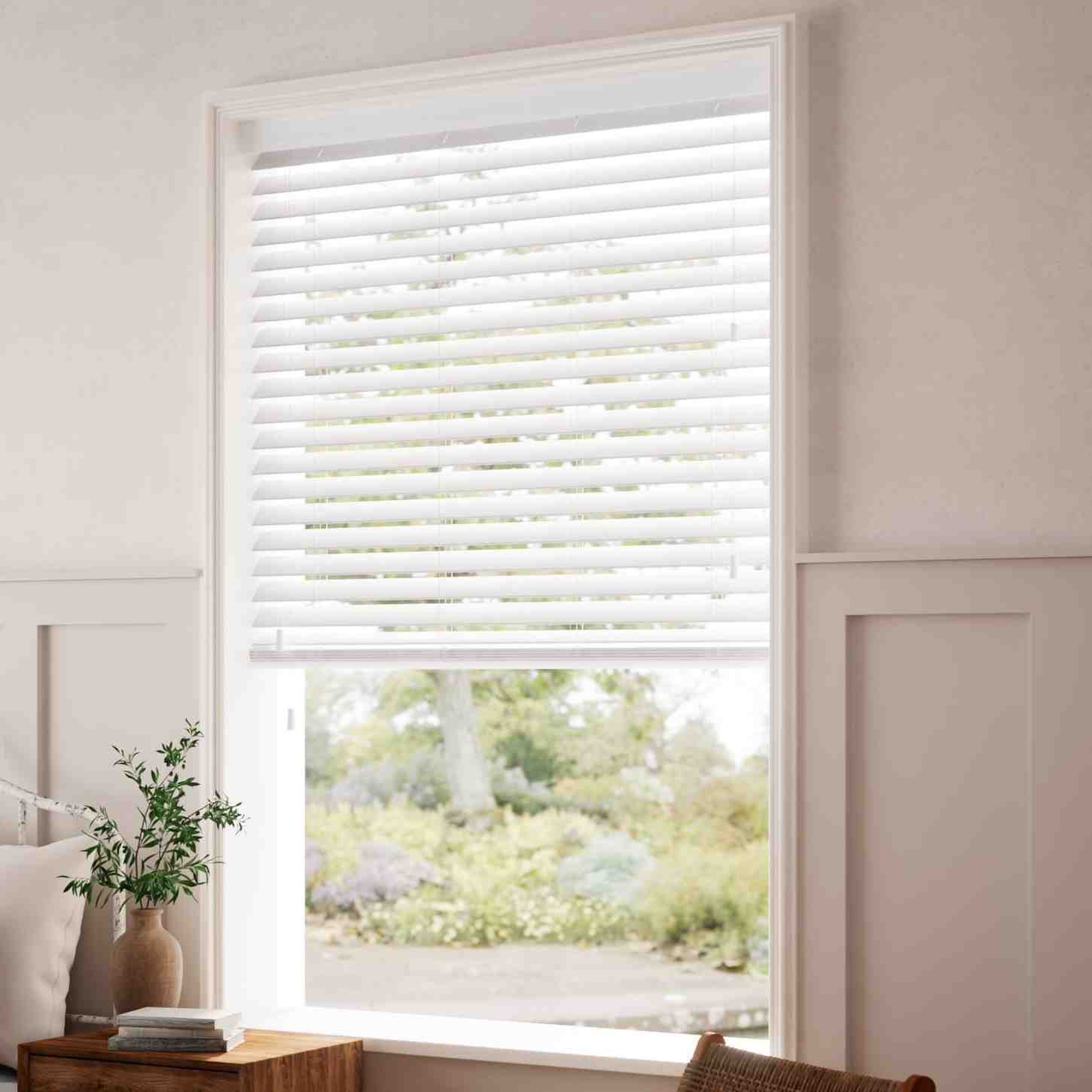 This brilliant white faux wood blind print delivers a clean, bright look with durable slats, smooth light control, and timeless style—perfect for creating fresh, elegant, and modern interior spaces.