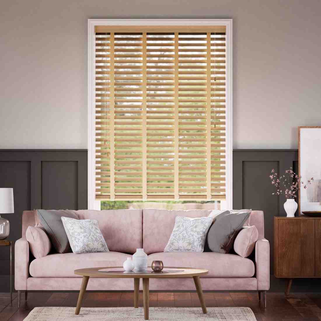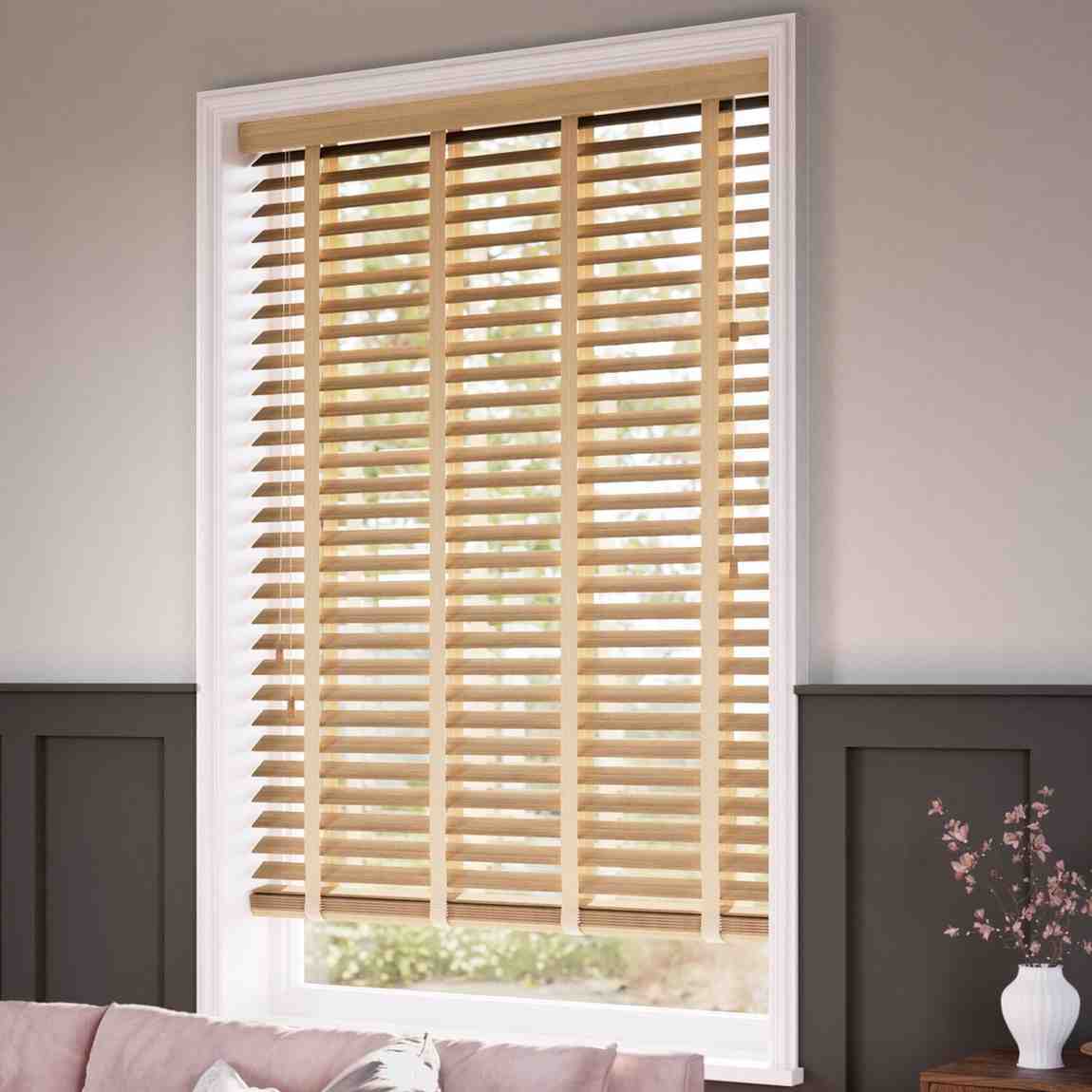 This majestic oak sand faux wood blind print blends warm tones with refined texture. Its durable slats offer smooth light control, added privacy, and an elegant finish ideal for cozy, modern, and stylish interiors.