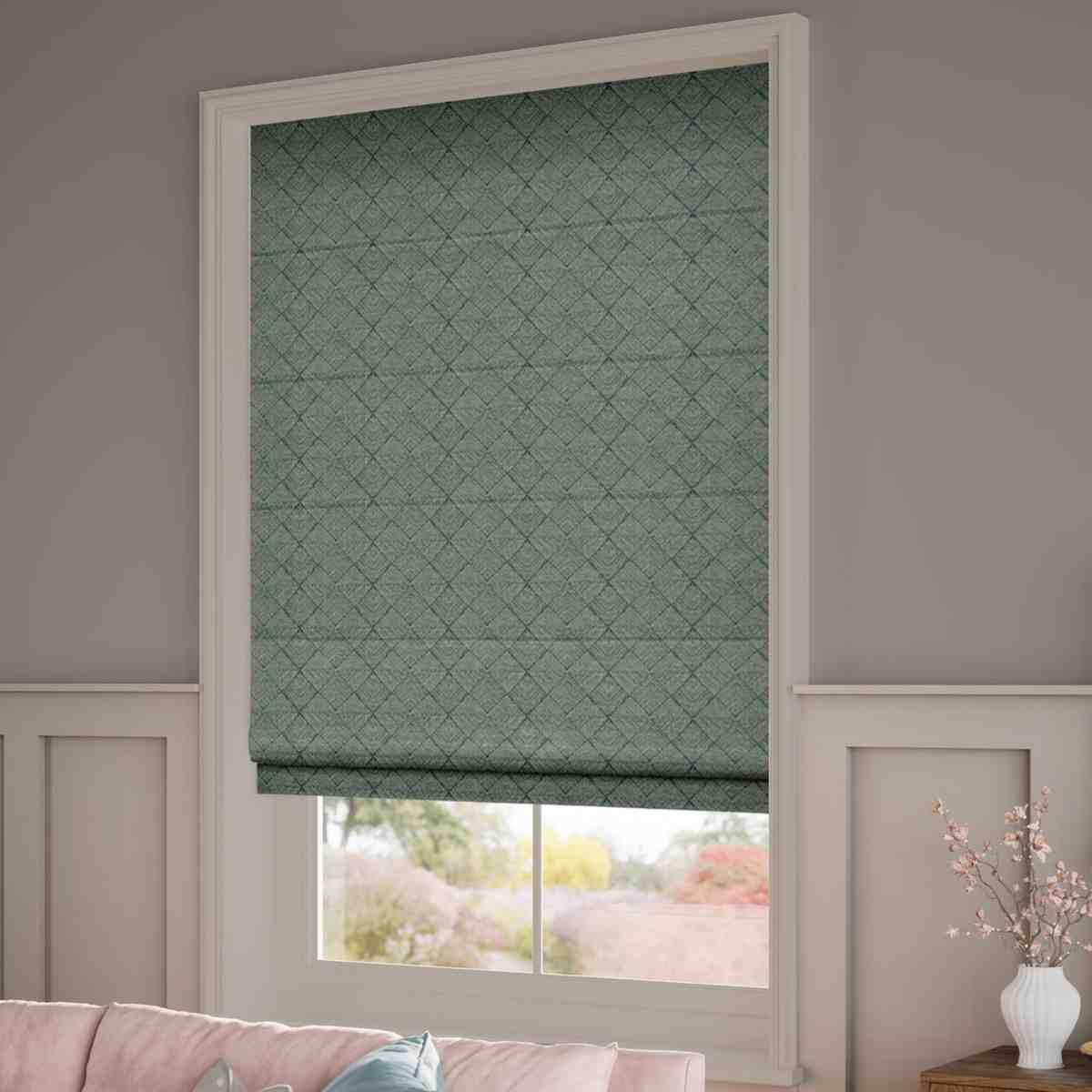 This motorized Elysee Kingfisher Roman blind combines vibrant color with modern convenience. Its durable fabric ensures smooth operation, effective light control, and privacy, adding a stylish and elegant touch to any interior.